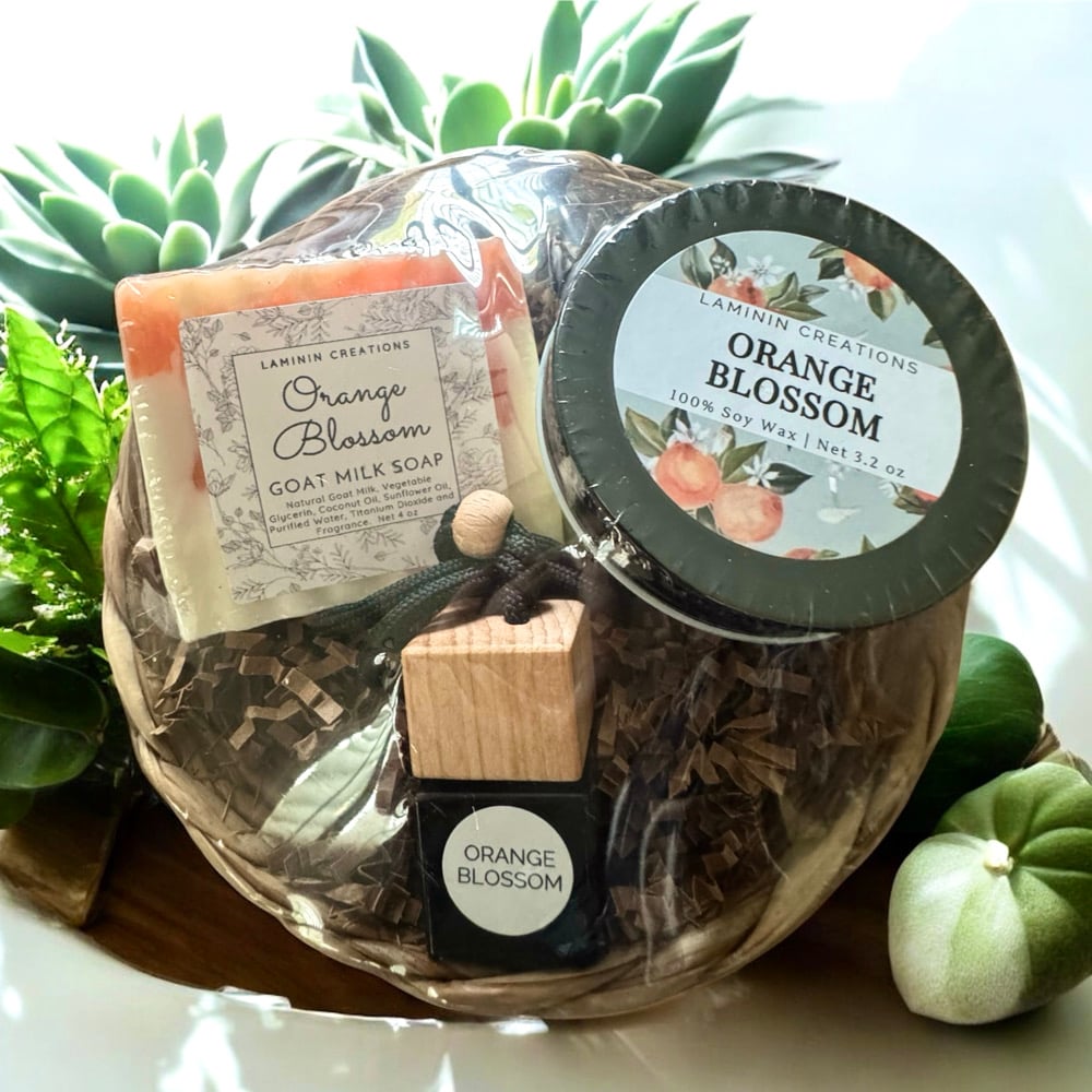 Pamper yourself or gift someone special with our beautiful Bath Gift Sets, suitable for any occasion or a self-care indulgence. Select from two alluring scents: Lavender Fields or Orange Blossom. Each set includes: Natural Soy Candle, Organic Lotion Balm, Natural Goat Milk Soap and a Car Diffuser.